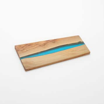 A jaw-dropping way to serve hors d’oeuvres and charcuteries. These high-end, food-safe serving boards infuse stunning olive wood with a streak of vibrant blue polyresin.