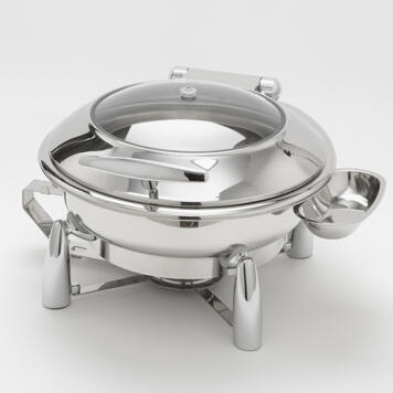 The Evolution round stainless steel induction chafer holds 7 qt. of your sides, pastas, vegetables or entrées in a luxurious package for beautiful presentation. Not only is its lid transparent so guests can see what’s inside, it’s hinged with a slow-release feature so the cover won’t be misplaced or slammed. At 12″ high and dimensions of 20-1/2″ L x 20″ W x 12″ H, it’s a wonderful way to “round” out your buffet spread.